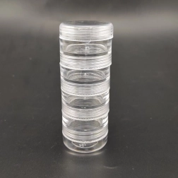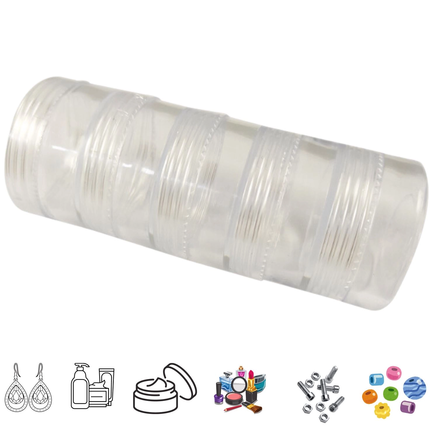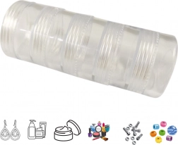 Praktyczny zestaw pięciu przezroczystych pojemników do przechowywania ułatwia organizację drobiazgów w domu i w warsztacie. Dzięki przezroczystemu materiałowi zawsze masz podgląd zawartości, a zakręcane wieczka zapewniają bezpieczne zamknięcie. Idealne na koraliki, brokat, kamienie, biżuterię i inne drobne elementy.