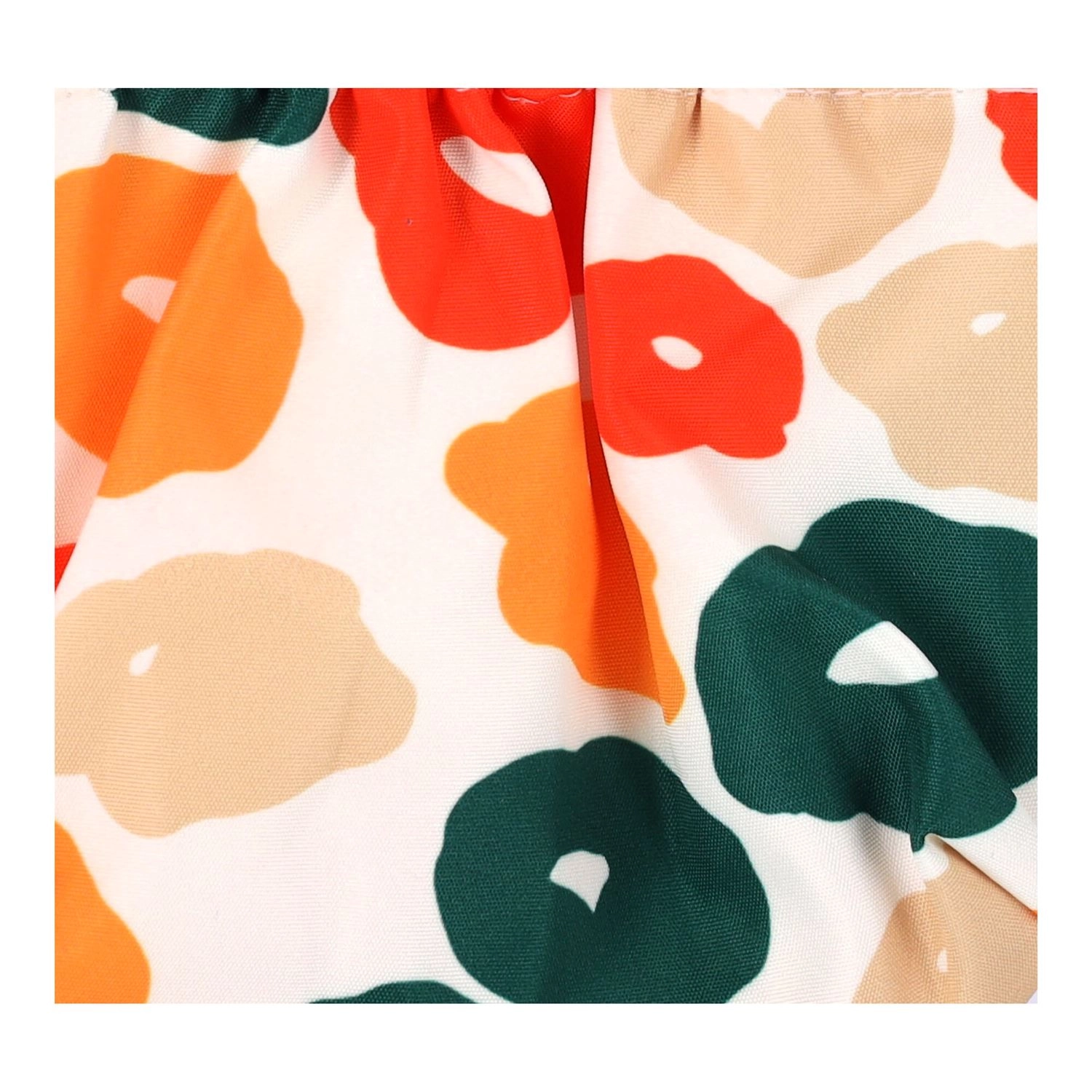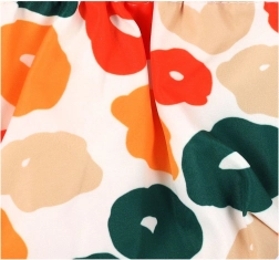 - Kwiatowy wzór w zieleni, pomarańczu, czerwieni i beżu na białym tle
