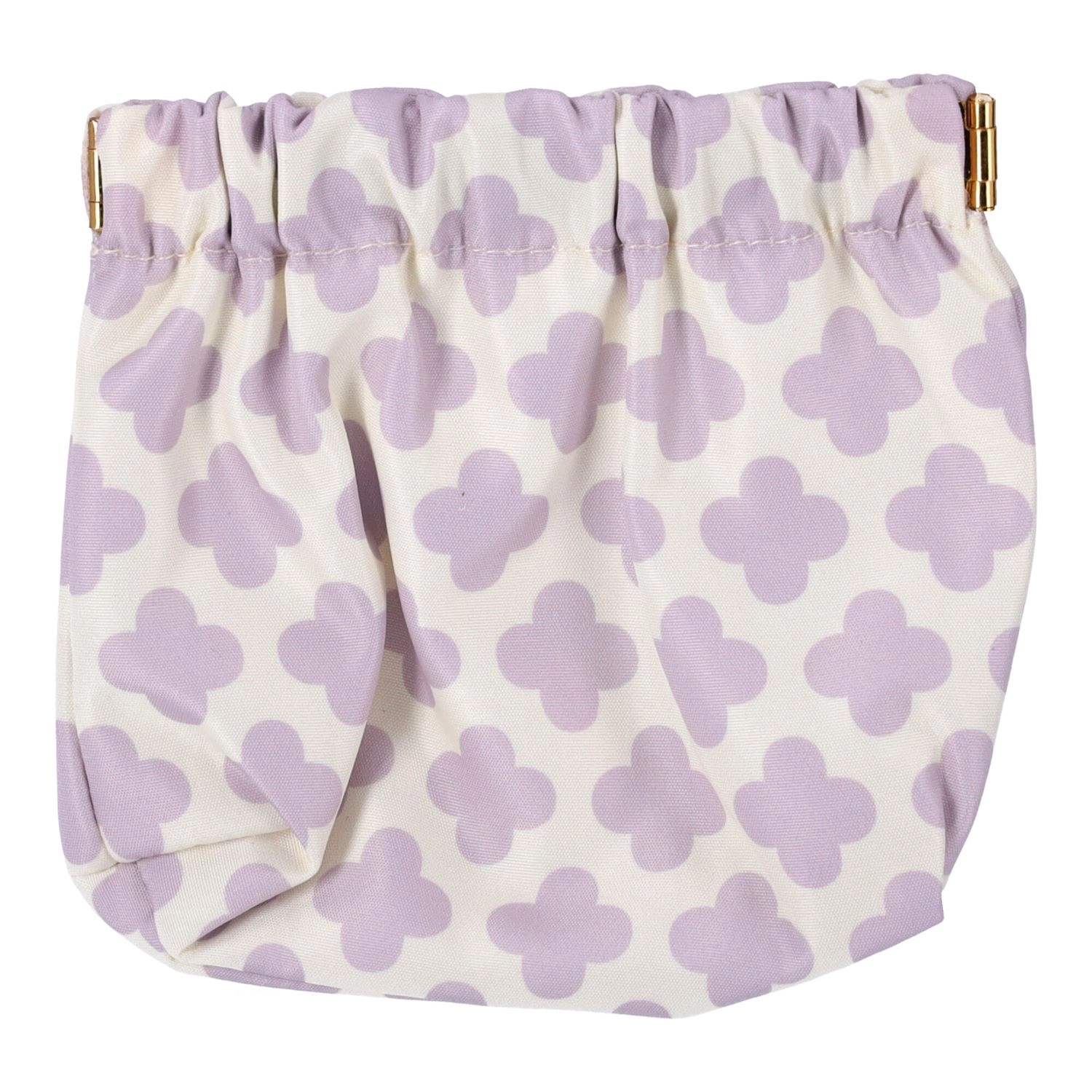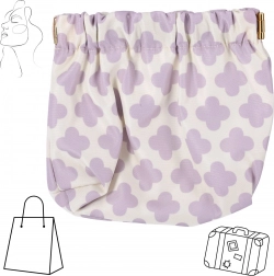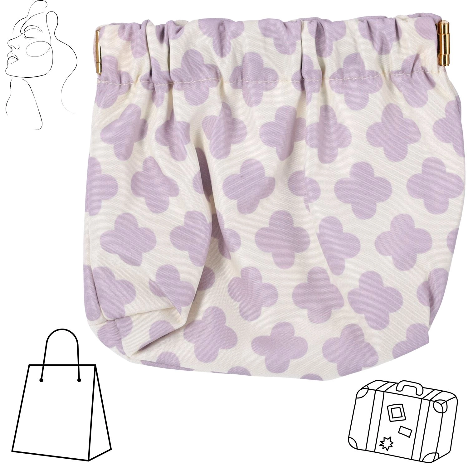 Kosmetyczka wykonana jest z wysokiej jakości tkaniny z delikatnym, kobiecym wzorem w odcieniu lawendy na białym tle. Elastyczne ściągnięcie umożliwia szybkie otwieranie i niezawodne zamykanie, dzięki czemu zawartość się nie wysypie. Jest lekka, miękka i świetnie trzyma kształt.
