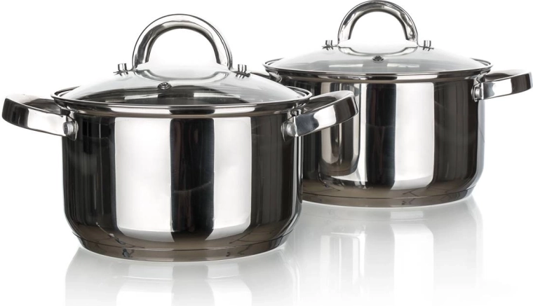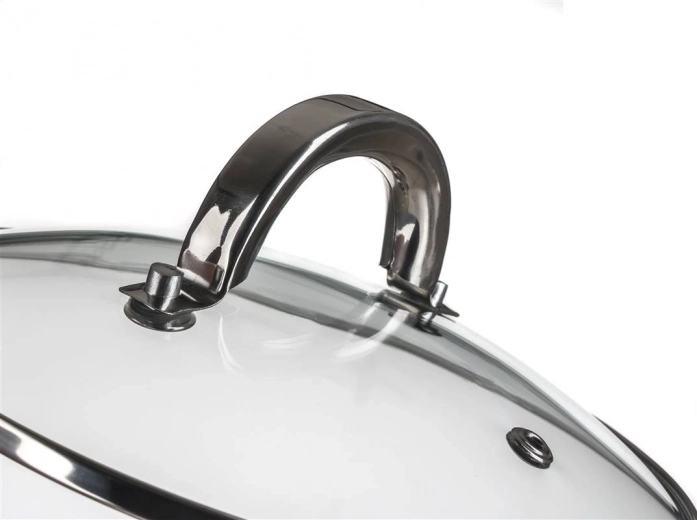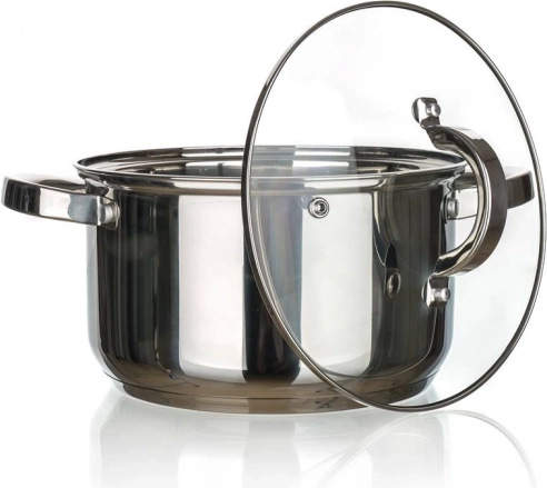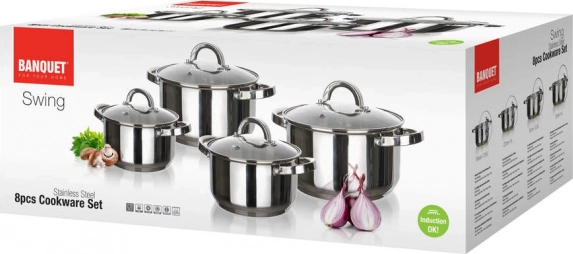 Zestaw naczyń Swing 8 szt. z nierdzewnej stali zawiera: garnek 16 x 10 cm z pokrywką, garnek 18 x 11 cm z pokrywką, garnek 20 x 12 cm z pokrywką, garnek 24 x 14 cm z pokrywką. Naczynia można używać na wszystkich typach kuchenek. Pokrywki wykonane są z hartowanego szkła i mają otwór na parę, co zapewnia doskonałą kontrolę gotowania. Wykończenie: polerowana stal nierdzewna (wewnątrz i na zewnątrz). Naczynia są wygodne w trzymaniu i można je myć w zmywarce. Uchwyty są przykręcone do garnka.