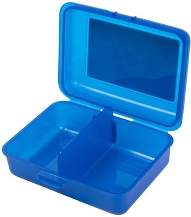 Pudełko wykonane jest z trwałego materiału i ma prostą konstrukcję z wbudowanymi przegrodami, które dzielą przestrzeń wewnątrz. Umożliwia to podział na połowy, dzięki czemu łatwo oddzielisz różne rodzaje przekąsek. Przednie zatrzaskowe zamknięcie ułatwia otwieranie i zamykanie, co zapewnia bezpieczeństwo przechowywanej żywności.