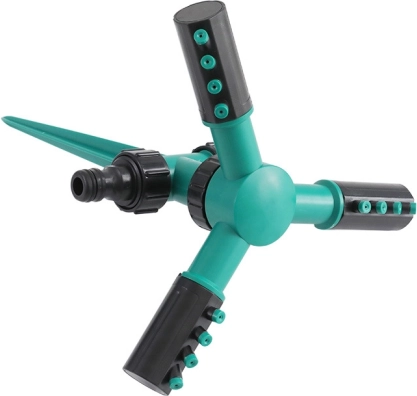 Efektywne nawadnianie: Dzięki trzem ramionom i obrotowej głowicy zraszacz równomiernie rozprowadza wodę po powierzchni ogrodu, co zapewnia skuteczne nawadnianie trawnika, roślin i krzewów.