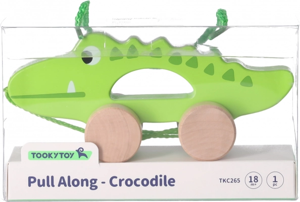 Krokodyl Pusher do ciągnięcia od Tooky Toy został wykonany z drewna. Przedstawia uroczego krokodyla, który ciągnięty za sznurek porusza się za dzieckiem. Sznurek jest specjalnie zaprojektowany dla dzieci, przyjemny i wygodny w dotyku. Zabawka ma stabilne i ciche 4 kółka oraz otwór, który umożliwia dziecku łatwe chwycenie krokodyla i pchanie go. Krokodyl jest idealną zabawką do nauki chodzenia, ponieważ zachęca do ruchu.