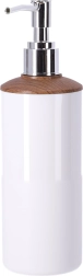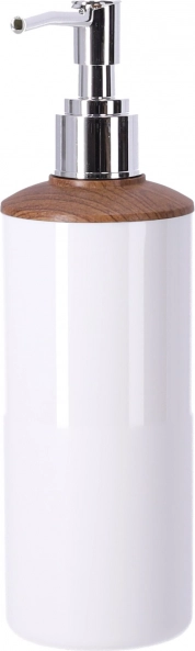 Nowoczesny dozownik z czystą białą obudową i drewnianym detalem zapewnia precyzyjne i oszczędne dozowanie mydła w płynie. Łatwy do uzupełniania i idealnie współgra z pozostałymi elementami zestawu.