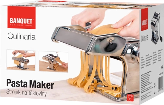Ciesz się domowym makaronem dokładnie według swojego gustu z ręczną maszynką BANQUET Culinaria. Oferuje szerokość wałka 14 cm, 9 stopni grubości oraz dwa noże do cięcia o szerokości 2 i 6 mm. Dzięki solidnej konstrukcji ze stali nierdzewnej i prostemu ręcznemu sterowaniu przygotujesz tagliatelle, fettuccine, spaghetti oraz szerokie płaty na lasagne szybko i z profesjonalnym efektem.