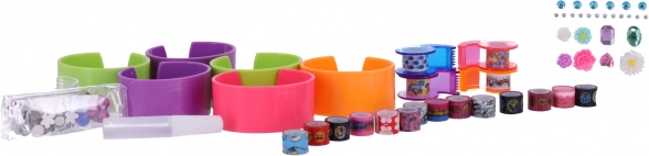 - kolorowe gumki, ozdoby/kamienie biżuteryjne, pierścienie i dyski do warstwowania, taśmy do bransoletek