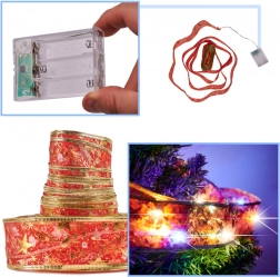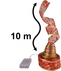 Ta świąteczna taśma łączy dekoracyjny wygląd z efektem świetlnym. Złoto-czerwony pas z wbudowanymi diodami LED tworzy delikatne, kolorowe światło na całej długości i doskonale sprawdzi się na choince, balustradzie, gzymsie kominkowym oraz w świątecznych aranżacjach. Zasilanie bateryjne pozwala na użycie bez dostępu do gniazdka.