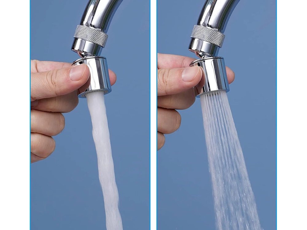 Ruchomy perlator 360° z 2 trybami strumienia. Łatwa instalacja, uniwersalny gwint 22 mm, oszczędność wody i wyższy komfort mycia w kuchni i łazience.