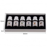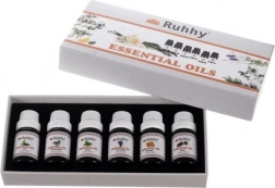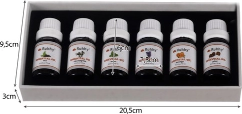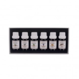 Zestaw zawiera sześć różnych zapachów jak eukaliptus, pomarańcza, drzewo herbaciane, mięta, lawenda i sosna. Każdy olejek jest starannie zamknięty w buteleczce o pojemności 10 ml.