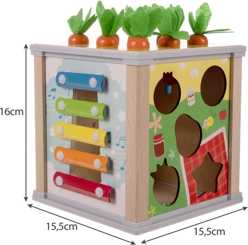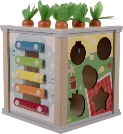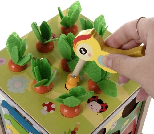 - Różnorodne gry: Zawiera cymbałki, sorter kształtów, koła zębate, zegar i magnetyczne robaczki z marchewkami.