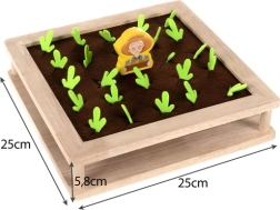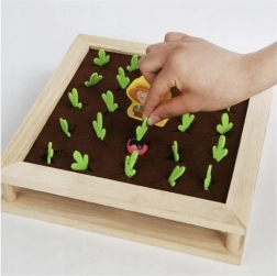 Ta drewniana gra edukacyjna 2w1 łączy swobodną zabawę z nauką. Dzieci mogą „sadzić” i zbierać filcowe elementy warzyw w ogródku, sortować i liczyć koraliki według kolorów do miseczek albo zagrać w memory z tematycznymi kartami. Solidna drewniana plansza jest dwustronna – jedna strona służy do wkładania kuleczek i treningu chwytu, druga oferuje farmerską grę na pamięć i spostrzegawczość.