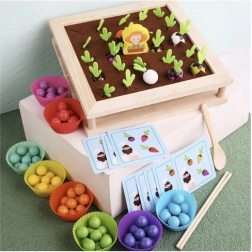 Odkryj zabawną drewnianą grę 2w1, w której dzieci uczą się sortowania, liczenia i ćwiczą pamięć w tematyce farmy. Jedna strona służy jako kolorowa tablica koralikowa do przesypywania i wkładania za pomocą pęsety i łyżeczki, druga to gra pamięciowa z kartami (memory) oraz „ogródek” z filcami plonami. Trwałe drewniane wykonanie, żywe kolory i bogate akcesoria rozwijają motorykę małą, koordynację ręka–oko, logiczne myślenie i cierpliwość.