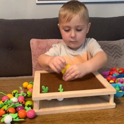 Dwustronna plansza oferuje matrycę koralików do sortowania i wkładania oraz ogródek z kartami do gry memory. Dzięki temu dzieci łatwo zmieniają aktywności i trenują różne umiejętności.