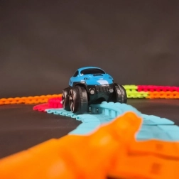 Elementy łatwo się zatrzaskują, a samochodzik trzyma się toru, dzięki czemu pokonuje pętle i ostre zakręty.