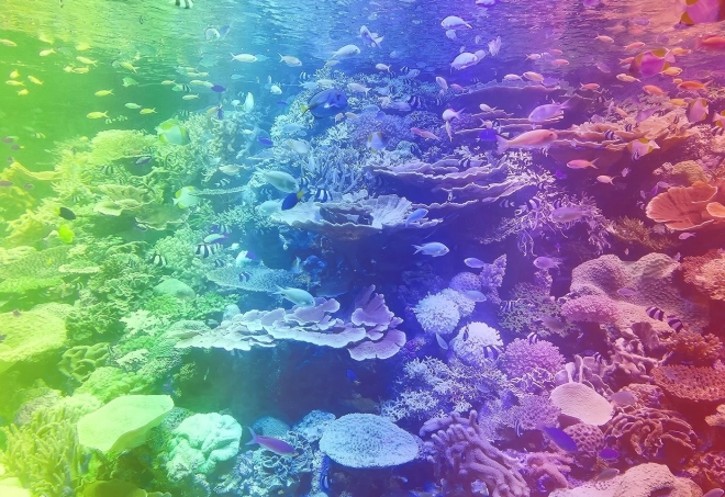 Układaj według kolorowego motywu rafy koralowej lub spróbuj wyzwania układania według kształtów na tylnej stronie z wzorem.