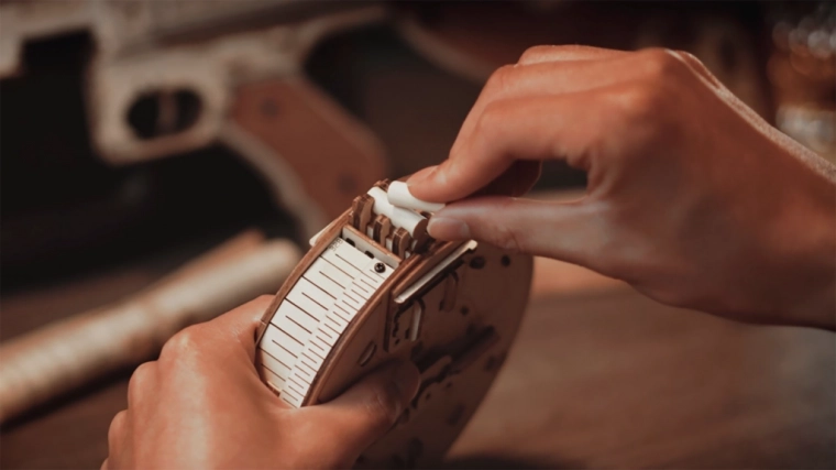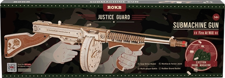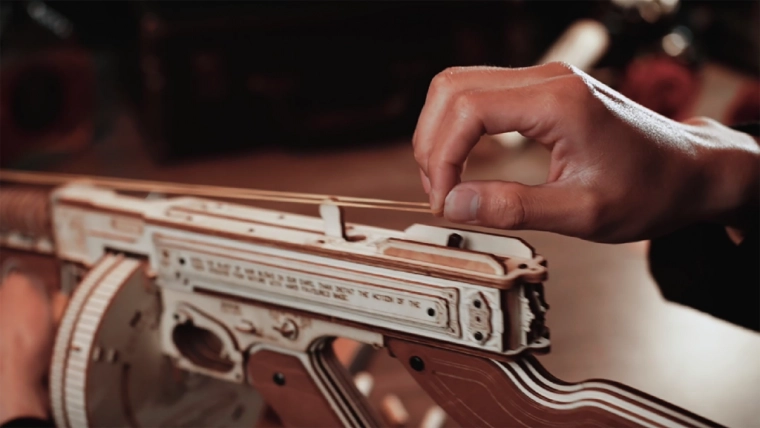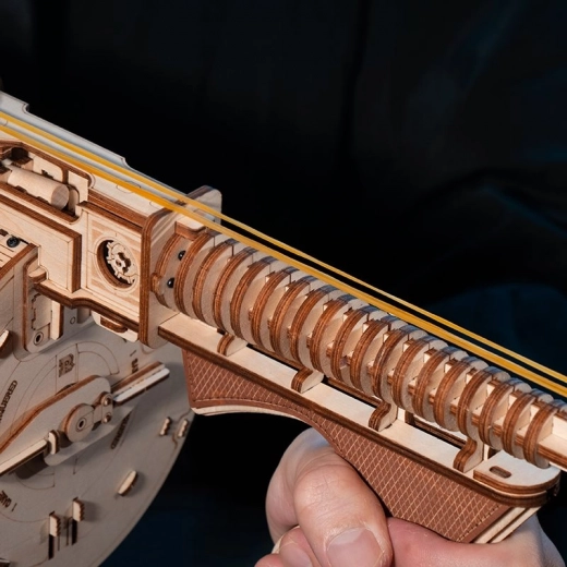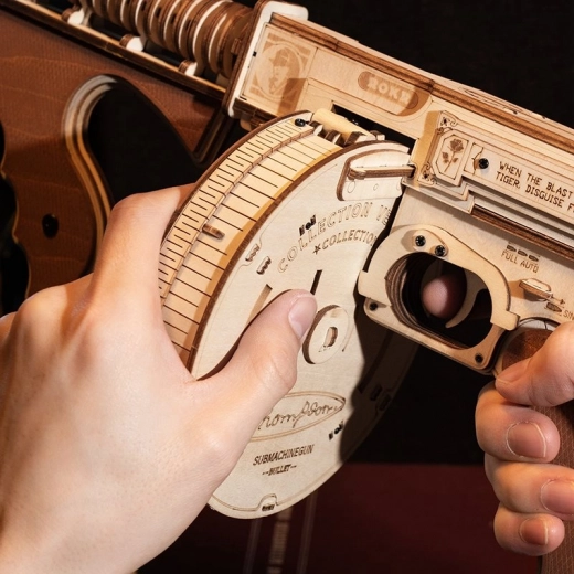 Ta drewniana mechaniczna układanka oferuje realistyczne wrażenia z ikonicznego pistoletu maszynowego THOMPSON. Dzięki precyzyjnemu cięciu laserowemu elementy perfekcyjnie do siebie pasują, a montaż jest płynny i satysfakcjonujący. Po ukończeniu otrzymasz imponujący model z funkcyjnym mechanizmem na gumki, który naprawdę strzela.