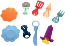 W opakowaniu znajdziesz 5 kubeczków masy plastycznej w różnych kolorach, które można mieszać, tworząc nowe odcienie. Bogaty zestaw narzędzi (nożyk, widelec, łyżka, talerzyki, kubeczki i różne nasadki) wspiera kreatywną zabawę, rozwój umiejętności i radosne zabawy w kucharza.