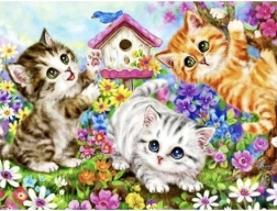 Stwórz radosny obraz z motywem trzech kociąt w kwitnącym ogrodzie. Gotowe płótno ożywi pokój dziecięcy, salon i gabinet.