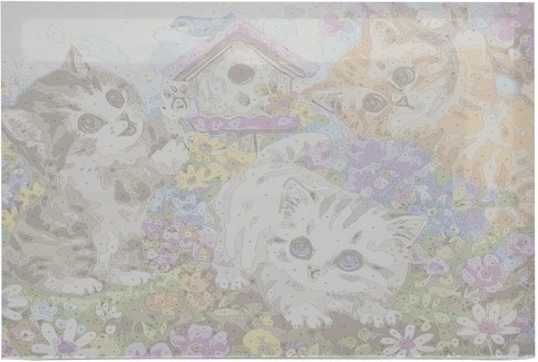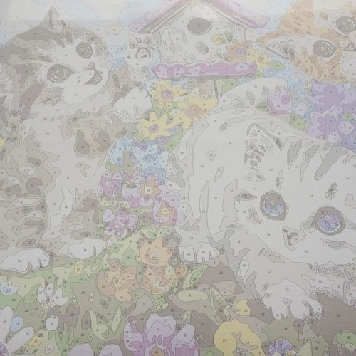 Ponumerowane pola na płótnie odpowiadają kubeczkom z farbami. Różne rozmiary pędzli pomogą oddać nawet drobne detale kwiatów i kociąt.