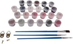 - Płótno na drewnianej ramie, zestaw farb akrylowych, 3 × pędzel, wzór/miniatura obrazu, 2 × haczyk + śrubki, 2 × haczyk bezśladowy