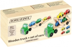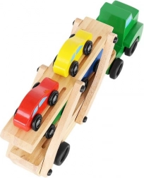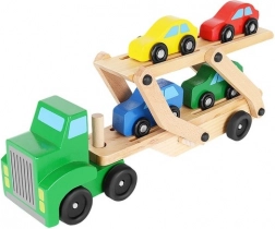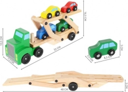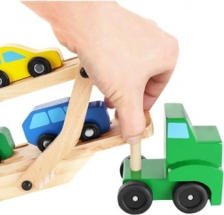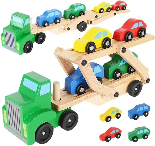 Drewniany autotransporter oferuje realistyczne funkcje, które dzieci uwielbiają – odłączaną naczepę, składaną górną platformę dla łatwego najazdu oraz płynnie toczące się koła. Cztery autka w kolorach czerwonym, niebieskim, żółtym i zielonym zachęcają do zabawy, sortowania i wyścigów, a przy tym pomagają w rozpoznawaniu kolorów i koordynacji ręka–oko.