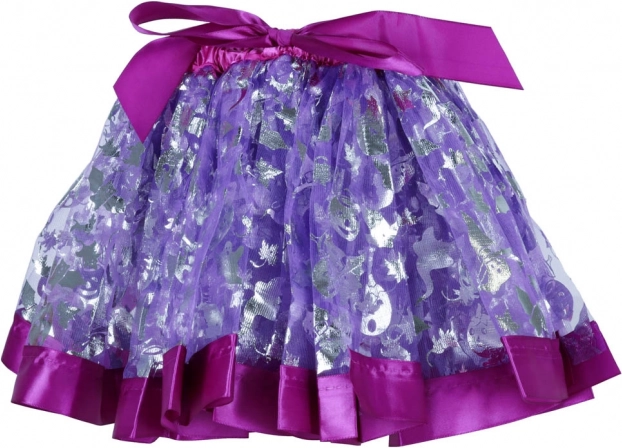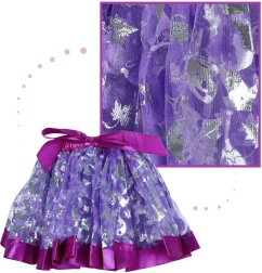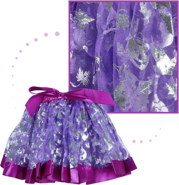 Fioletowa spódniczka z błyszczącymi srebrnymi wzorami i elastycznym pasem łatwo dopasowuje się do różnych sylwetek.