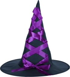 Czarno‑fioletowy kapelusz z charakterystyczną skrzyżowaną fioletową wstążką dodaje kostiumowi autentyczności.