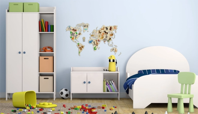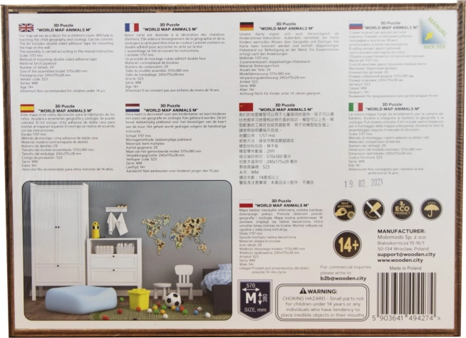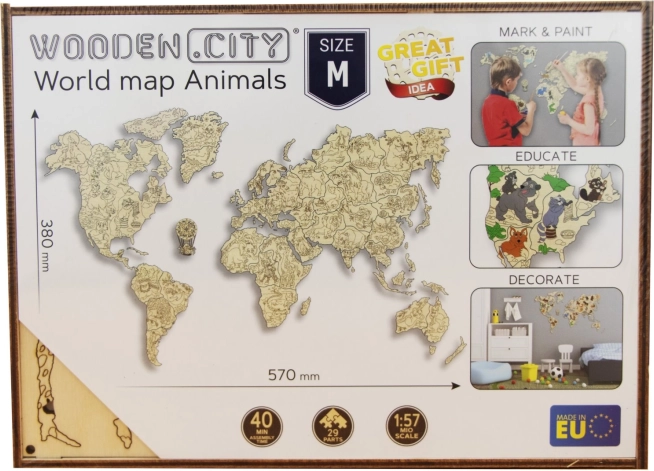 Stylowa drewniana mapa świata ze zwierzątkami od WOODEN CITY to piękna dekoracja do pokoju dziecięcego, która wspiera kreatywność oraz zainteresowanie przyrodą i geografią. Dzięki łatwemu montażowi za pomocą dwustronnej taśmy klejącej szybko umieścisz ją na ścianie, drzwiach lub szafie. Wykonana z wysokiej jakości sklejki brzozowej, aż zachęca do pokolorowania.