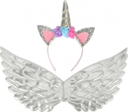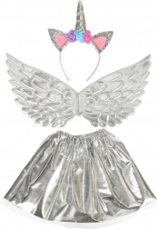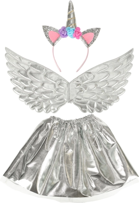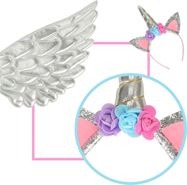 Ten wspaniały kostium pozwoli przemienić Twoje dziecko w niezwykłego jednorożca. Składa się ze srebrnej spódnicy, eleganckich skrzydeł oraz starannie wykonanej opaski z różyczkami. Idealny na każdą okazję, podczas której dziecko może cieszyć się bajkową zabawą.