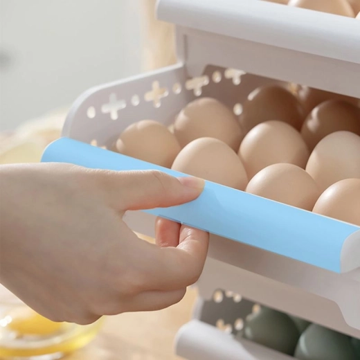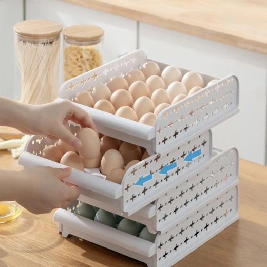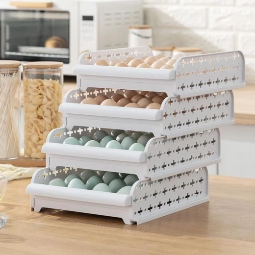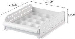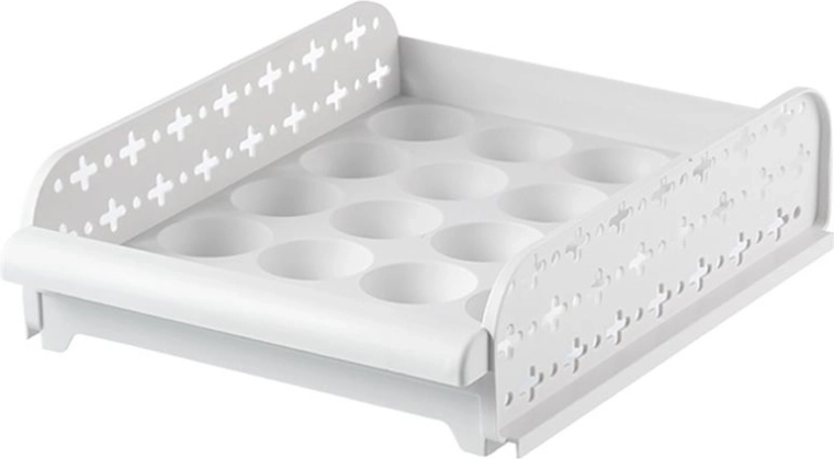 Praktyczny pojemnik do przechowywania jaj zapewniający odpowiednią wentylację. Tacki można układać jedna na drugiej i wysuwać jak szuflady.