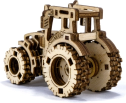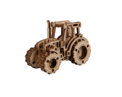Laserowo wycinane części ze sklejki tworzą realistyczny wygląd traktora z zębatkami i oponami.