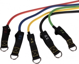 Pięć gum w różnych kolorach obejmuje pełne spektrum obciążeń. Łącząc kilka gum jednocześnie, łatwo dopasujesz opór dla górnych i dolnych partii ciała.