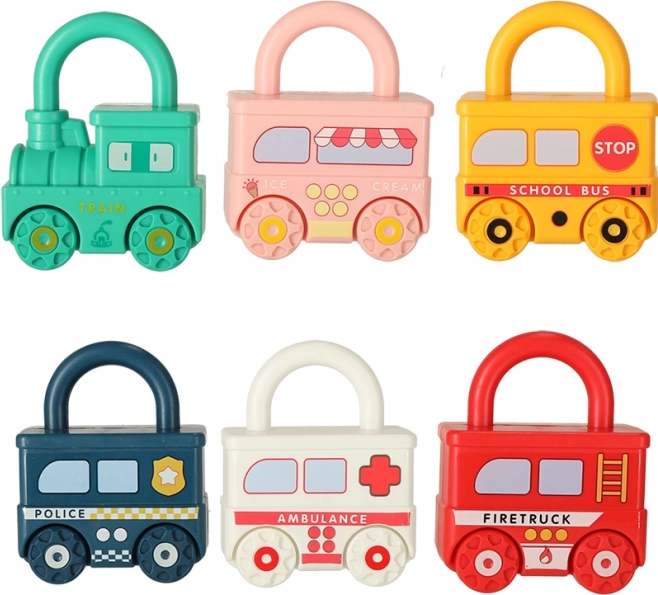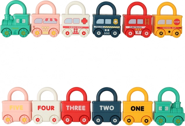 Montessori zestaw zamykanych autek z kluczykami – pociąg i pojazdy, 13 elementów