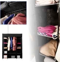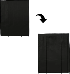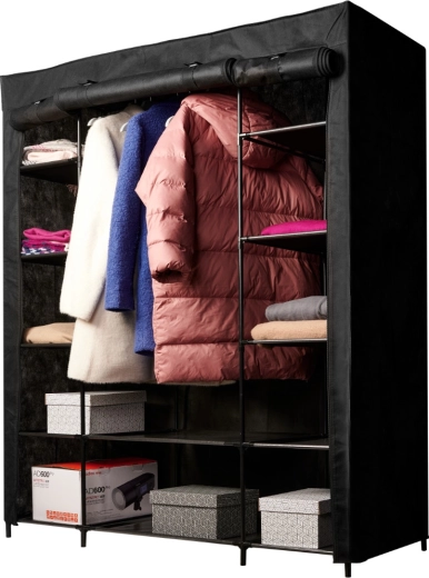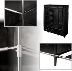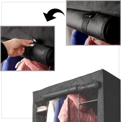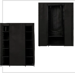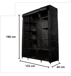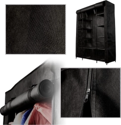 Zorganizuj swoją garderobę i zyskaj więcej miejsca dzięki tej przestronnej tekstylnej szafie XXL w czarnym kolorze. Oferuje dużą pojemność, praktyczne półki i drążek na wieszaki, drzwi na zamek błyskawiczny dla estetycznego wyglądu oraz trwałą, a jednocześnie lekką konstrukcję ułatwiającą przenoszenie.