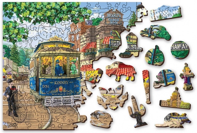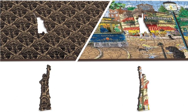 Eleganckie drewniane puzzle z motywem nostalgicznej ulicy oferują dwie drogi do ukończenia: awers ze szczegółową ilustracją oraz rewers ze wzorem do układania według kształtów. Czeka Cię wyższy poziom trudności dzięki specjalnie wycinanym elementom w kształcie zwierząt, budowli i przedmiotów, które mogą służyć także jako małe figurki. Idealny wybór dla dorosłych i bardziej zaawansowanych młodszych układaczy szukających oryginalnego wyzwania.