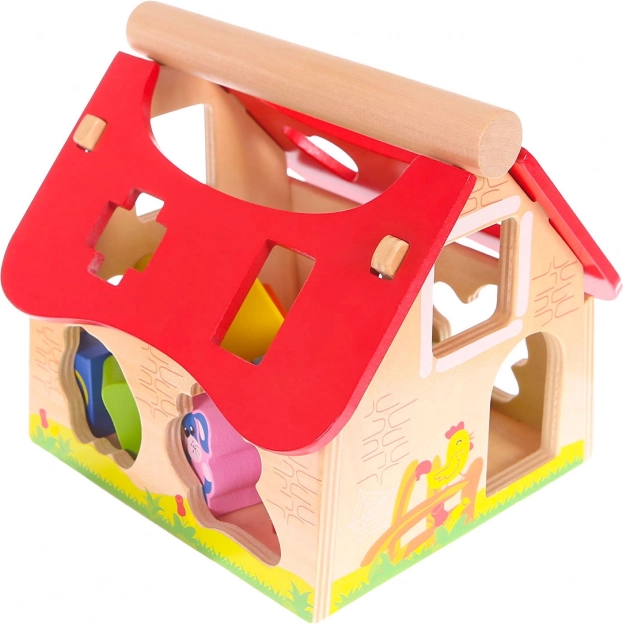 Ten drewniany domek – układanka z motywem farmy oferuje dzieciom mnóstwo odkrywania. Dzięki otworom o różnych kształtach i zestawowi 12 klocków dzieci ćwiczą sortowanie kształtów, rozpoznawanie kolorów i zwierzątek. Zabawka wspiera koncentrację, cierpliwość i radość z sukcesu przy każdym prawidłowym dopasowaniu elementu.