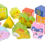 Kolorowe drewniane klocki z odpowiadającymi im otworami pomagają dzieciom ćwiczyć sortowanie, logikę i rozpoznawanie. Niektóre elementy mają formę zwierząt z farmy, dzięki czemu dziecko w naturalny sposób poszerza słownictwo i wyobraźnię.