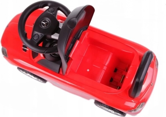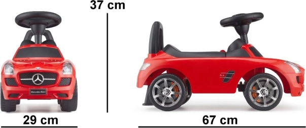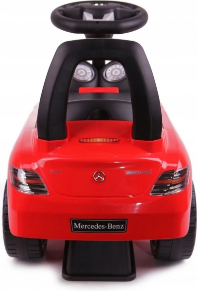 Stylowy dziecięcy jeździk MERCEDES‑BENZ SLS AMG w czerwonym kolorze oferuje realistyczny wygląd samochodu sportowego i bezpieczną zabawę w domu i na zewnątrz. Dzięki lekkiej konstrukcji, wygodnemu siedzisku ze schowkiem i kierownicy łatwej w obsłudze wspiera rozwój koordynacji i samodzielności. Trwałe plastikowe koła ze srebrnymi felgami zapewniają płynną jazdę.