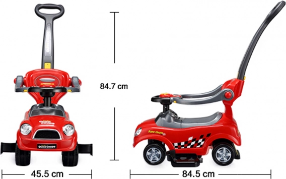 Inteligentne rozwiązanie 3 w 1 oferuje trzy tryby użytkowania: bezpieczny tryb z barierkami ochronnymi i podnóżkami dla najmłodszych, tryb z rączką do prowadzenia dla łatwego sterowania przez rodzica oraz klasyczny jeździk do samodzielnej jazdy, gdy dziecko dosięga stopami ziemi. Dzięki temu to uniwersalna zabawka, która rośnie z Twoim dzieckiem i dostosowuje się do jego umiejętności.