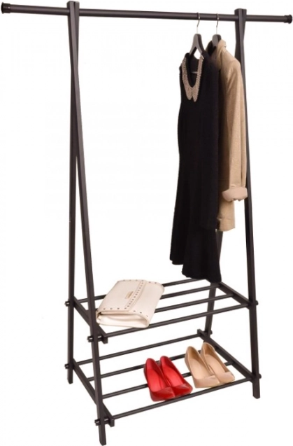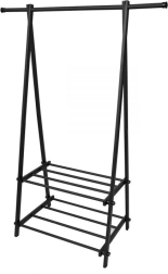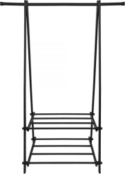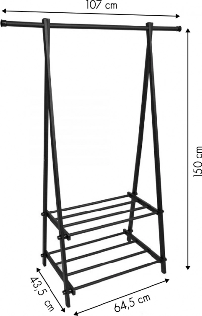 Kompaktowy i lekki stojak garderobiany pomoże utrzymać porządek w ubraniach i akcesoriach. Minimalistyczny design łatwo wpasuje się w nowoczesne wnętrza i zapewni wystarczająco dużo miejsca na płaszcze, koszule i kurtki, a dwie półki pomieszczą buty, pudełka lub torebki.