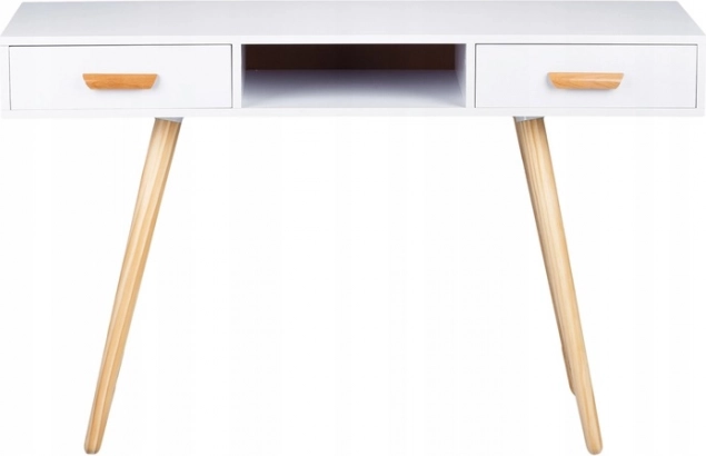 Laminowany blat jest odporny na zarysowania i przebarwienia, co docenisz podczas codziennego użytkowania. Lite sosnowe nogi zapewniają solidność i stabilność bez niepożądanego kołysania. Dwie pojemne szuflady i centralna otwarta wnęka pomieszczą kosmetyki, artykuły biurowe oraz drobne akcesoria.