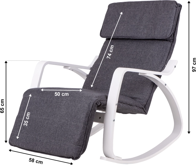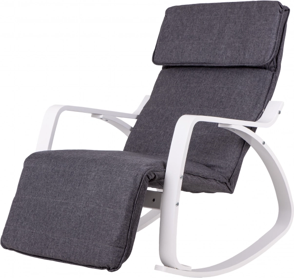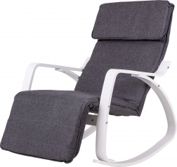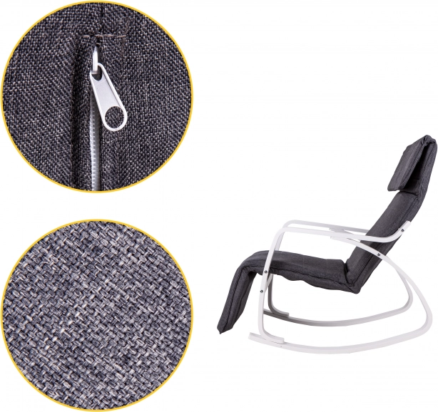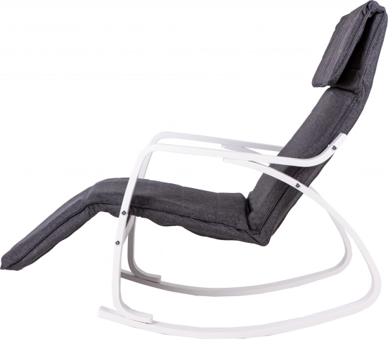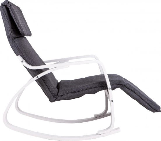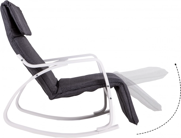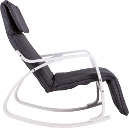 Fotel bujany ModernHome został zaprojektowany z myślą o maksymalnym komforcie i spokoju. Jego solidna metalowa konstrukcja w białym wykończeniu jest uzupełniona szarym materiałowym obiciem, które zapewnia przytulne siedzenie. Dzięki regulacji podnóżka w pięciu stopniach, łatwo ustawisz idealną pozycję.