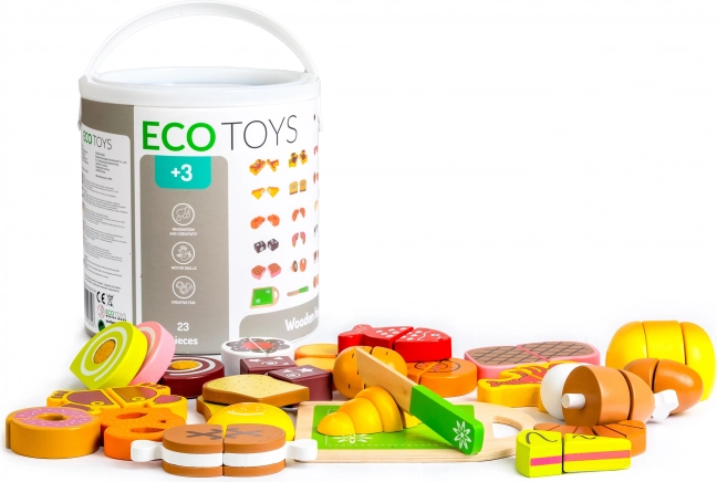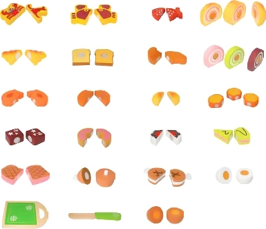 Produkty składają się z dwóch lub trzech części, które są połączone suchym zamkiem, co umożliwia krojenie i widok na wewnętrzne części produktów. Zestaw zawiera drewnianą deskę i nóż. Suchy zamek przy krojeniu stawia opór i naśladuje dźwięk cięcia prawdziwych produktów.