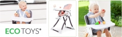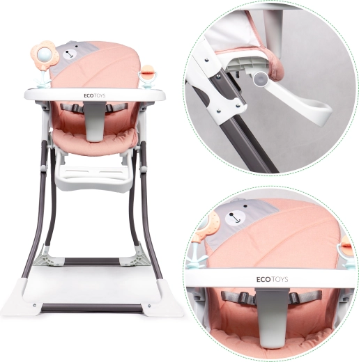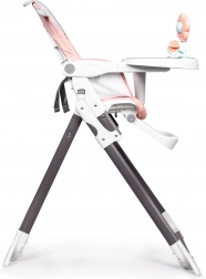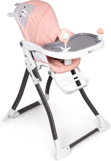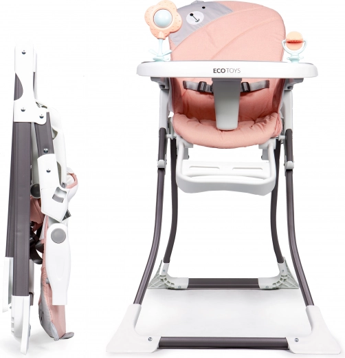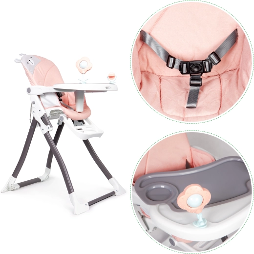 Na tacy znajdują się dwie kolorowe zabawki, które zachęcą malucha do zabawy i umilą korzystanie z krzesełka.