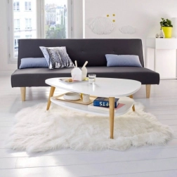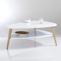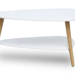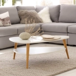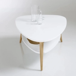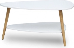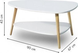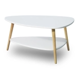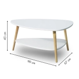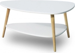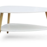 Stolik kawowy oferuje biał y blat z drewnianymi nogami oraz dolną półką dla większej przestrzeni do przechowywania.