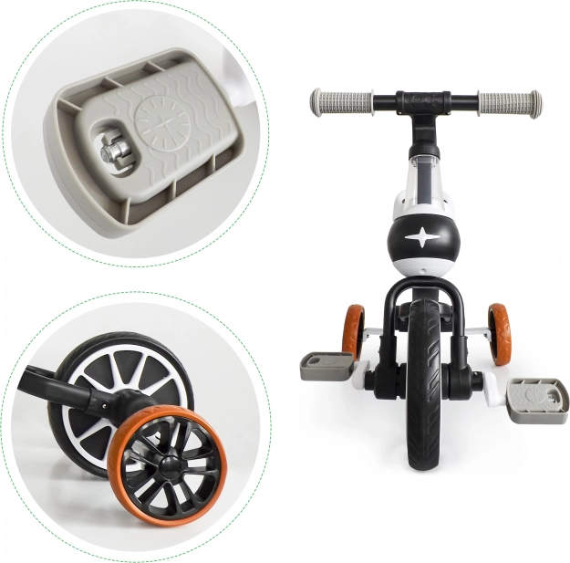 Pedały można łatwo podłączyć lub odłączyć, co znacząco zmienia charakter zabawy i wspiera wzrost pewności siebie dziecka podczas nauki jazdy na rowerze.