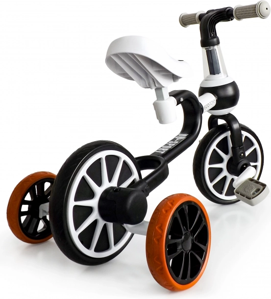 Rowerek 4w1 dopasowuje się do umiejętności dziecka dzięki regulowanej wysokości siodełka oraz odpinanym pedałom i bocznym kółkom.