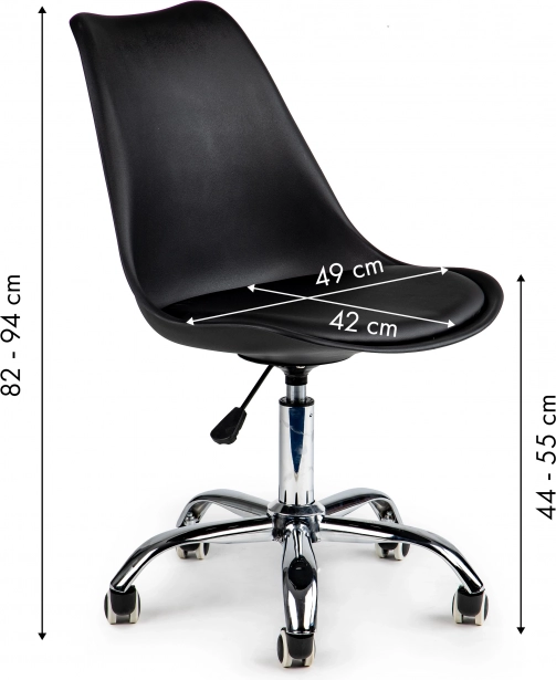 WYGODA W TWOIM WŁASNYM BIURZEAby efektywnie pracować przy biurku, potrzebujesz krzesła, które zapewni wygodę podczas długiej pracy przy komputerze. Fotel obrotowy ModernHome to idealne rozwiązanie do biur, domowych stanowisk pracy lub recepcji w firmach. Czarny kolor z chromowanymi dodatkami idealnie pasuje do nowoczesnych wnętrz. |