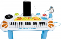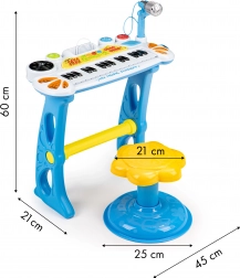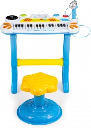 Rozwiń muzyczną wyobraźnię swojego dziecka dzięki temu kolorowemu elektronicznemu pianinu ze stołkiem, mikrofonem i możliwością podłączenia telefonu/MP3. Oferuje 31 klawiszy, wstępnie zaprogramowane melodie, efekty dźwiękowe instrumentów i karaoke – idealny prezent dla małych muzyków od 3 lat.