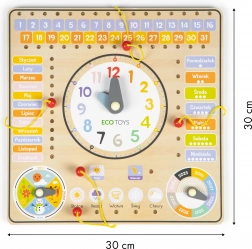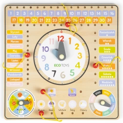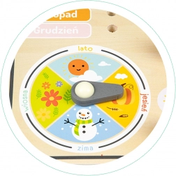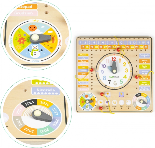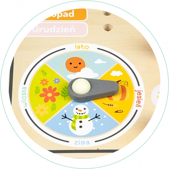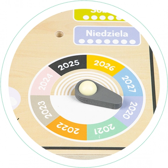 Tablica zawiera polskie nazwy, ale jest idealna także dla dzieci czeskich dzięki swojej przejrzystości i wytrzymałej drewnianej konstrukcji. Umożliwia lepsze zrozumienie różnorodności pór roku dzięki obrotowemu wskaźnikowi. Na tablicy można również zaznaczyć rok w zakresie 2020–2027.